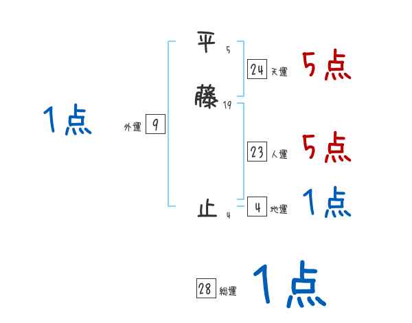 総運![]() | 平藤止さんの総運は28画の1つ星!家庭環境に注意。スポーツで活躍できる能力があるかも。 あなたの人生を表す1番重要な運勢です。生涯を通じて影響する総合運となり、主に50歳以降の晩年期に影響を及ぼします。 |