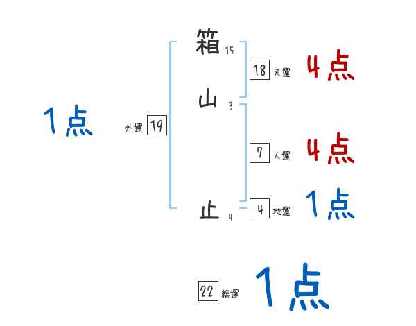 総運![]() | 箱山止さんの総運は22画の1つ星!努力することが苦手ないっぽう手先が器用。芸術性にも優れる。 あなたの人生を表す1番重要な運勢です。生涯を通じて影響する総合運となり、主に50歳以降の晩年期に影響を及ぼします。 |