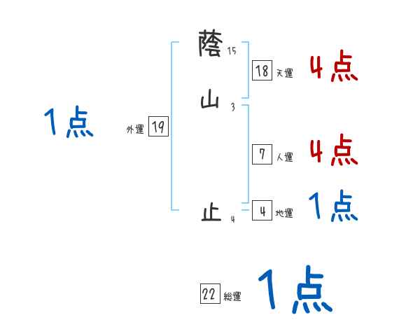 総運![]() | 蔭山止さんの総運は22画の1つ星!努力することが苦手ないっぽう手先が器用。芸術性にも優れる。 あなたの人生を表す1番重要な運勢です。生涯を通じて影響する総合運となり、主に50歳以降の晩年期に影響を及ぼします。 |