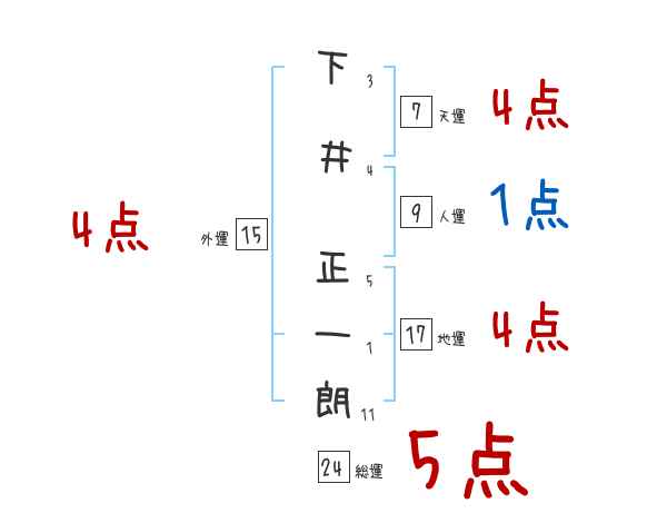 天運![]() | 下井正一朗さんの天運は7画の4つ星!強い意志や信念を持ち独立心が強い。自立する。 家系が持つ宿命的な運勢を表します。祖先から受け継いだ苗字ですので自分の力が及びません。家柄を象徴します。 |