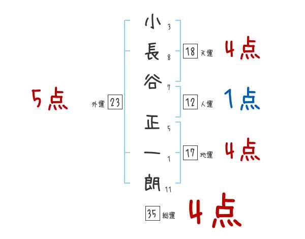 天運![]() | 小長谷正一朗さんの天運は18画の4つ星!情熱的で剛気。忍耐力があり信頼される。 家系が持つ宿命的な運勢を表します。祖先から受け継いだ苗字ですので自分の力が及びません。家柄を象徴します。 |