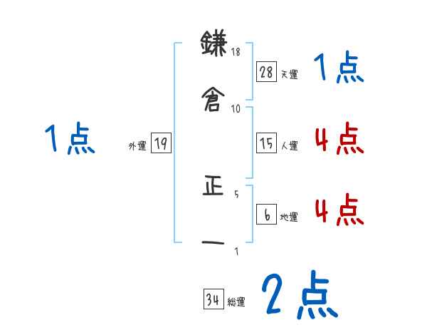 天運![]() | 鎌倉正一さんの天運は28画の1つ星!家庭環境に注意。スポーツで活躍できる能力があるかも。 家系が持つ宿命的な運勢を表します。祖先から受け継いだ苗字ですので自分の力が及びません。家柄を象徴します。 |