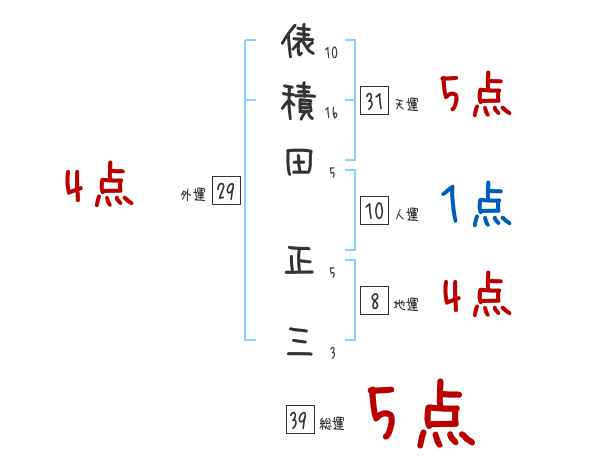 人運![]() | 俵積田正三さんの人運は10画の1つ星!不安を感じやすい傾向。ストレスを抱えないように注意しましょう。 性格や才能などを表す2番目に重要な運勢です。人間関係や協調性、社会的な成功に影響します。主に20歳から50歳ぐらいまでの中年期の運勢を表します。 |