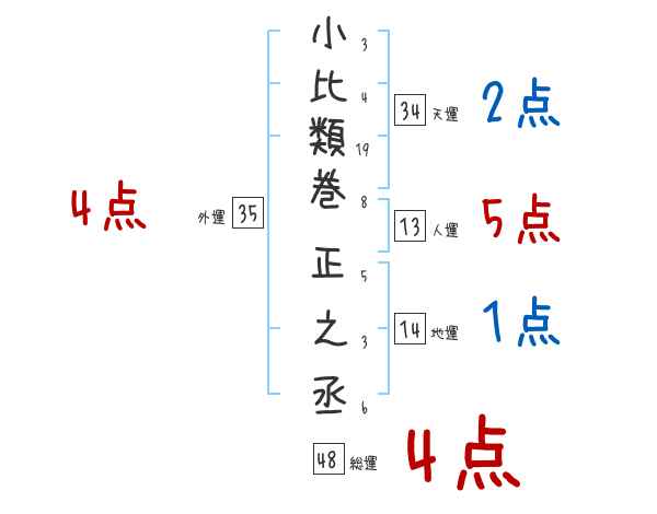 外運![]() | 小比類巻正之丞さんの外運は35画の4つ星!温厚な性格で感受性が高い。穏和な性格で人望が厚い。 生活面を象徴する運勢です。外部から受ける影響力を表し、結婚運、家庭運や職場、環境への順応性を表します。 |
