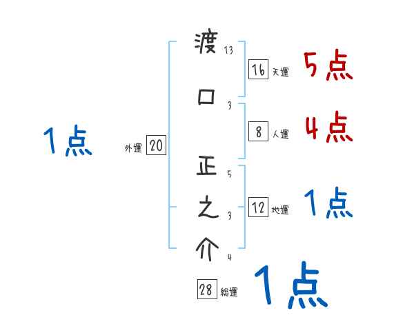 天運![]() | 渡口正之介さんの天運は16画の5つ星!人望が厚く大きく発展する。逆転成功が見える。 家系が持つ宿命的な運勢を表します。祖先から受け継いだ苗字ですので自分の力が及びません。家柄を象徴します。 |