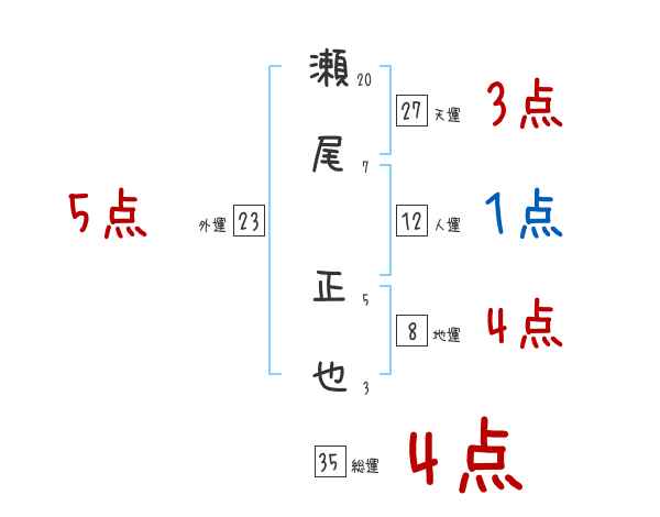 外運![]() | 瀬尾正也さんの外運は23画の5つ星!想像力に優れ活力がある。一代で成功し名誉を手に入れる。 生活面を象徴する運勢です。外部から受ける影響力を表し、結婚運、家庭運や職場、環境への順応性を表します。 |