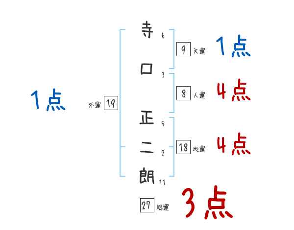 天運![]() | 寺口正二朗さんの天運は9画の1つ星!消極的で才能を発揮することが苦手なことも。周りの意見に耳を傾けましょう。 家系が持つ宿命的な運勢を表します。祖先から受け継いだ苗字ですので自分の力が及びません。家柄を象徴します。 |