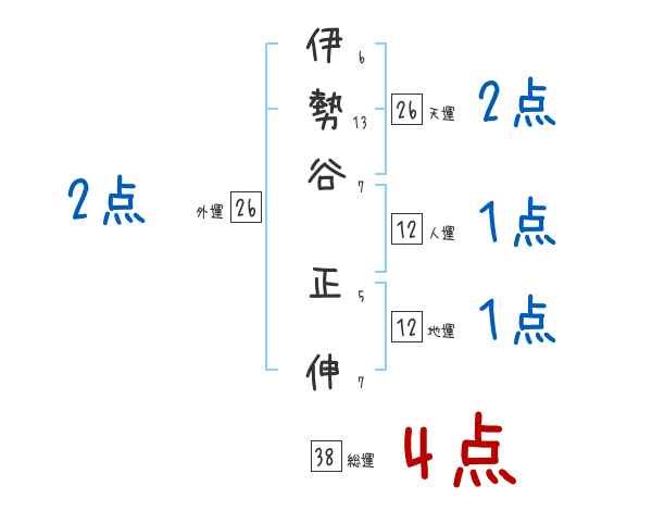 外運![]() | 伊勢谷正伸さんの外運は26画の2つ星!波瀾万丈かも。信頼できる人を大事にしましょう。 生活面を象徴する運勢です。外部から受ける影響力を表し、結婚運、家庭運や職場、環境への順応性を表します。 |