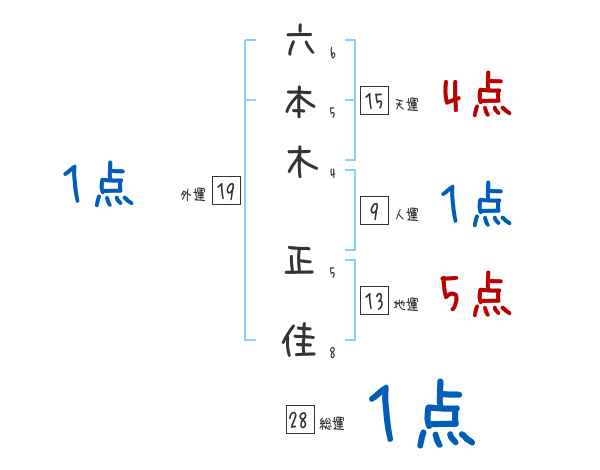 外運![]() | 六本木正佳さんの外運は19画の1つ星!優れた才能を持ちますが、協調性が足りないことも。周りの人と協力する事を意識しましょう。 生活面を象徴する運勢です。外部から受ける影響力を表し、結婚運、家庭運や職場、環境への順応性を表します。 |