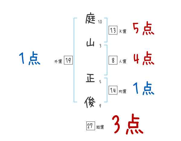 外運![]() | 庭山正俊さんの外運は19画の1つ星!優れた才能を持ちますが、協調性が足りないことも。周りの人と協力する事を意識しましょう。 生活面を象徴する運勢です。外部から受ける影響力を表し、結婚運、家庭運や職場、環境への順応性を表します。 |
