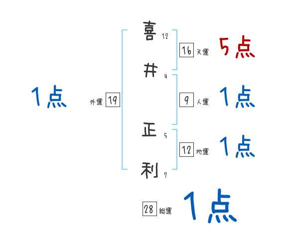 総運![]() | 喜井正利さんの総運は28画の1つ星!家庭環境に注意。スポーツで活躍できる能力があるかも。 あなたの人生を表す1番重要な運勢です。生涯を通じて影響する総合運となり、主に50歳以降の晩年期に影響を及ぼします。 |