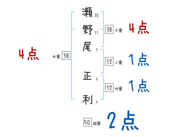 外運![]() | 瀬野尾正利さんの外運は38画の4つ星!温厚な性格で技術的な才能を発揮する。職人的な仕事に向いている。 生活面を象徴する運勢です。外部から受ける影響力を表し、結婚運、家庭運や職場、環境への順応性を表します。 |