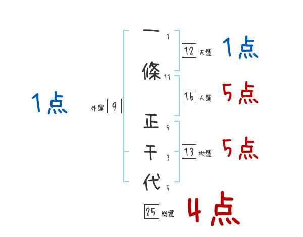 人運![]() | 一條正千代さんの人運は16画の5つ星!人望が厚く大きく発展する。逆転成功が見える。 性格や才能などを表す2番目に重要な運勢です。人間関係や協調性、社会的な成功に影響します。主に20歳から50歳ぐらいまでの中年期の運勢を表します。 |