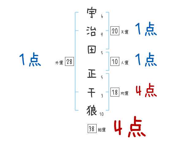 人運![]() | 宇治田正千狼さんの人運は10画の1つ星!不安を感じやすい傾向。ストレスを抱えないように注意しましょう。 性格や才能などを表す2番目に重要な運勢です。人間関係や協調性、社会的な成功に影響します。主に20歳から50歳ぐらいまでの中年期の運勢を表します。 |