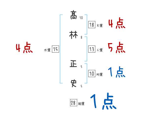 天運![]() | 髙林正史さんの天運は18画の4つ星!情熱的で剛気。忍耐力があり信頼される。 家系が持つ宿命的な運勢を表します。祖先から受け継いだ苗字ですので自分の力が及びません。家柄を象徴します。 |