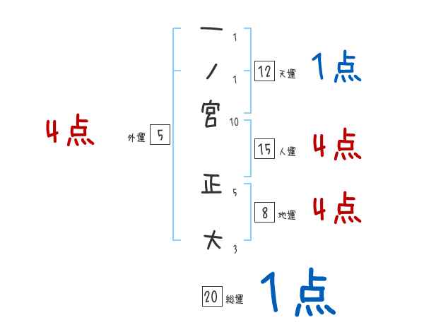 外運![]() | 一ノ宮正大さんの外運は5画の4つ星!健康で安泰。協調性に優れ、財産に恵まれる。 生活面を象徴する運勢です。外部から受ける影響力を表し、結婚運、家庭運や職場、環境への順応性を表します。 |