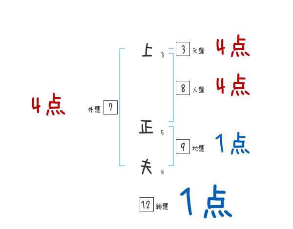 天運![]() | 上正夫さんの天運は3画の4つ星!活動的で才能に恵まれ、多くの信頼を得る。希望に満ち成長する。 家系が持つ宿命的な運勢を表します。祖先から受け継いだ苗字ですので自分の力が及びません。家柄を象徴します。 |