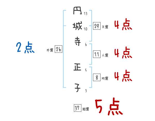 人運![]() | 円城寺正子さんの人運は11画の4つ星!着実に富や地位を得る幸運な人生。 性格や才能などを表す2番目に重要な運勢です。人間関係や協調性、社会的な成功に影響します。主に20歳から50歳ぐらいまでの中年期の運勢を表します。 |