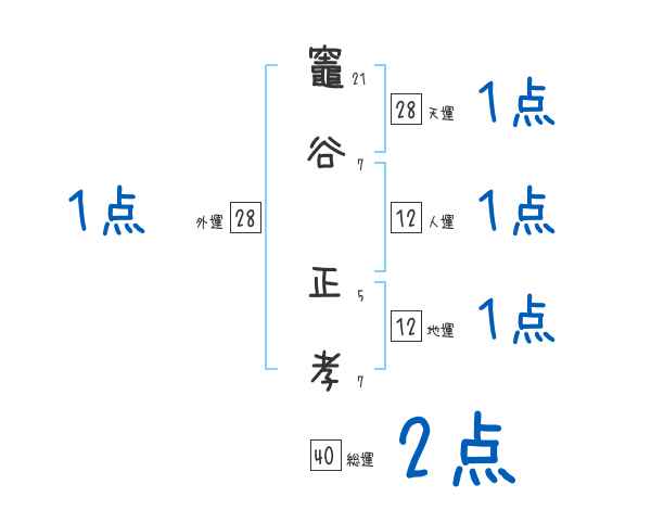 天運![]() | 竈谷正孝さんの天運は28画の1つ星!家庭環境に注意。スポーツで活躍できる能力があるかも。 家系が持つ宿命的な運勢を表します。祖先から受け継いだ苗字ですので自分の力が及びません。家柄を象徴します。 |