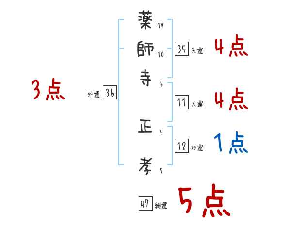 外運![]() | 薬師寺正孝さんの外運は36画の3つ星!先見性が豊かです。多少神経質で苦労することも。 生活面を象徴する運勢です。外部から受ける影響力を表し、結婚運、家庭運や職場、環境への順応性を表します。 |