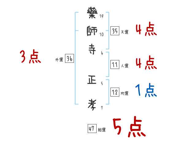 天運![]() | 藥師寺正孝さんの天運は35画の4つ星!温厚な性格で感受性が高い。穏和な性格で人望が厚い。 家系が持つ宿命的な運勢を表します。祖先から受け継いだ苗字ですので自分の力が及びません。家柄を象徴します。 |