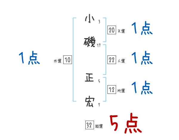 総運![]() | 小磯正宏さんの総運は32画の5つ星!柔軟性があり成功する。チャンスが多く金運が良い。 あなたの人生を表す1番重要な運勢です。生涯を通じて影響する総合運となり、主に50歳以降の晩年期に影響を及ぼします。 |