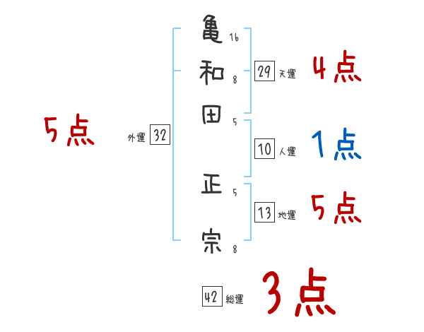 外運![]() | 亀和田正宗さんの外運は32画の5つ星!柔軟性があり成功する。チャンスが多く金運が良い。 生活面を象徴する運勢です。外部から受ける影響力を表し、結婚運、家庭運や職場、環境への順応性を表します。 |