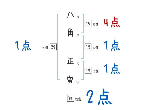 外運![]() | 八角正実さんの外運は22画の1つ星!努力することが苦手ないっぽう手先が器用。芸術性にも優れる。 生活面を象徴する運勢です。外部から受ける影響力を表し、結婚運、家庭運や職場、環境への順応性を表します。 |