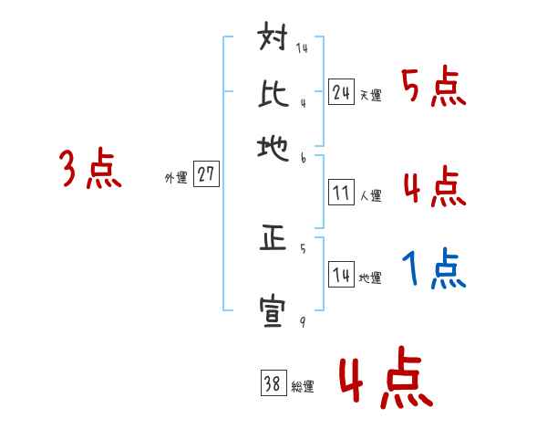 天運![]() | 対比地正宣さんの天運は24画の5つ星!家庭運が良く順調な人生。金運にも恵まれる。 家系が持つ宿命的な運勢を表します。祖先から受け継いだ苗字ですので自分の力が及びません。家柄を象徴します。 |