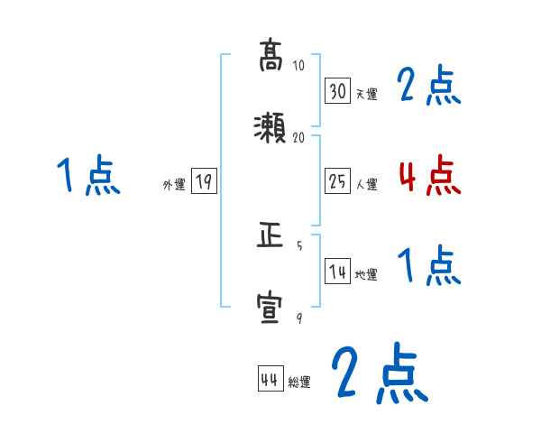 総運![]() | 髙瀬正宣さんの総運は44画の2つ星!誠実で慎重な性格。物事を考えすぎないように注意しましょう。 あなたの人生を表す1番重要な運勢です。生涯を通じて影響する総合運となり、主に50歳以降の晩年期に影響を及ぼします。 |