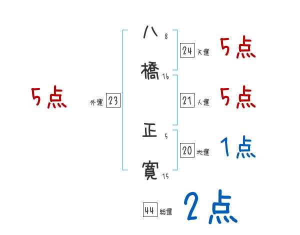天運![]() | 八橋正寛さんの天運は24画の5つ星!家庭運が良く順調な人生。金運にも恵まれる。 家系が持つ宿命的な運勢を表します。祖先から受け継いだ苗字ですので自分の力が及びません。家柄を象徴します。 |