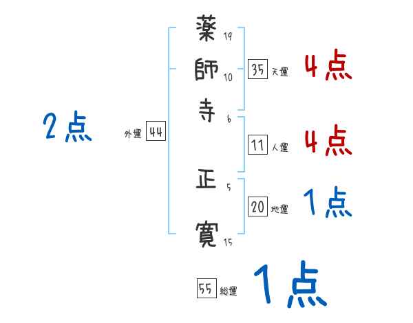 外運![]() | 薬師寺正寛さんの外運は44画の2つ星!誠実で慎重な性格。物事を考えすぎないように注意しましょう。 生活面を象徴する運勢です。外部から受ける影響力を表し、結婚運、家庭運や職場、環境への順応性を表します。 |