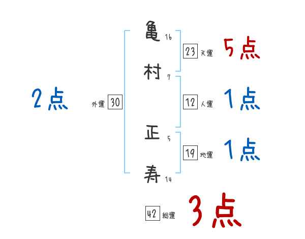 天運![]() | 亀村正寿さんの天運は23画の5つ星!想像力に優れ活力がある。一代で成功し名誉を手に入れる。 家系が持つ宿命的な運勢を表します。祖先から受け継いだ苗字ですので自分の力が及びません。家柄を象徴します。 |