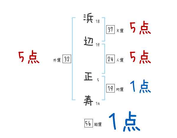 外運![]() | 浜辺正寿さんの外運は32画の5つ星!柔軟性があり成功する。チャンスが多く金運が良い。 生活面を象徴する運勢です。外部から受ける影響力を表し、結婚運、家庭運や職場、環境への順応性を表します。 |