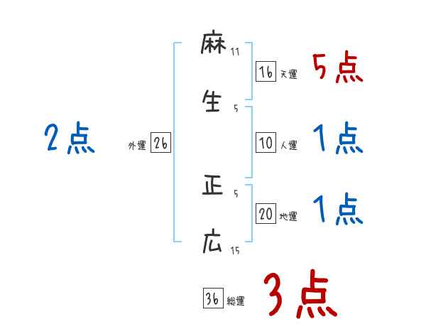 天運![]() | 麻生正広さんの天運は16画の5つ星!人望が厚く大きく発展する。逆転成功が見える。 家系が持つ宿命的な運勢を表します。祖先から受け継いだ苗字ですので自分の力が及びません。家柄を象徴します。 |