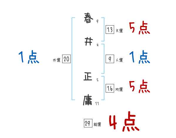人運![]() | 春井正庸さんの人運は9画の1つ星!消極的で才能を発揮することが苦手なことも。周りの意見に耳を傾けましょう。 性格や才能などを表す2番目に重要な運勢です。人間関係や協調性、社会的な成功に影響します。主に20歳から50歳ぐらいまでの中年期の運勢を表します。 |
