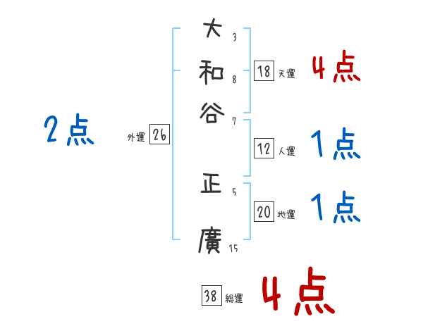 天運![]() | 大和谷正廣さんの天運は18画の4つ星!情熱的で剛気。忍耐力があり信頼される。 家系が持つ宿命的な運勢を表します。祖先から受け継いだ苗字ですので自分の力が及びません。家柄を象徴します。 |