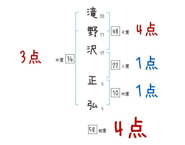 天運![]() | 滝野沢正弘さんの天運は48画の4つ星!賢明な性格で人望が厚い。指導力があり多くの人に尊敬される。 家系が持つ宿命的な運勢を表します。祖先から受け継いだ苗字ですので自分の力が及びません。家柄を象徴します。 |