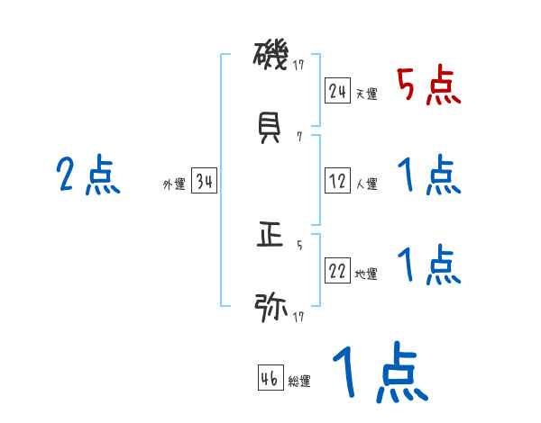 外運![]() | 磯貝正弥さんの外運は34画の2つ星!独創性に優れるが、自尊心が強く災難に注意しましょう。 生活面を象徴する運勢です。外部から受ける影響力を表し、結婚運、家庭運や職場、環境への順応性を表します。 |
