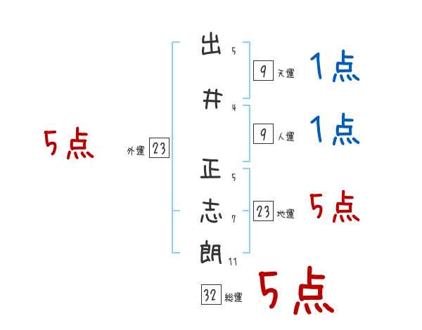 総運![]() | 出井正志朗さんの総運は32画の5つ星!柔軟性があり成功する。チャンスが多く金運が良い。 あなたの人生を表す1番重要な運勢です。生涯を通じて影響する総合運となり、主に50歳以降の晩年期に影響を及ぼします。 |