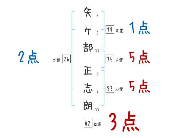 天運![]() | 矢ヶ部正志朗さんの天運は19画の1つ星!優れた才能を持ちますが、協調性が足りないことも。周りの人と協力する事を意識しましょう。 家系が持つ宿命的な運勢を表します。祖先から受け継いだ苗字ですので自分の力が及びません。家柄を象徴します。 |