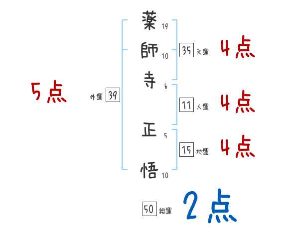 天運![]() | 薬師寺正悟さんの天運は35画の4つ星!温厚な性格で感受性が高い。穏和な性格で人望が厚い。 家系が持つ宿命的な運勢を表します。祖先から受け継いだ苗字ですので自分の力が及びません。家柄を象徴します。 |