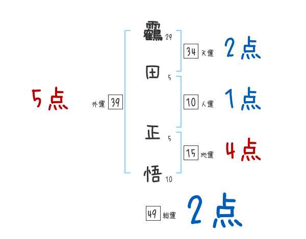 外運![]() | 靏田正悟さんの外運は39画の5つ星!社交性に優れ人望が厚い。人の上に立ち成功する。 生活面を象徴する運勢です。外部から受ける影響力を表し、結婚運、家庭運や職場、環境への順応性を表します。 |