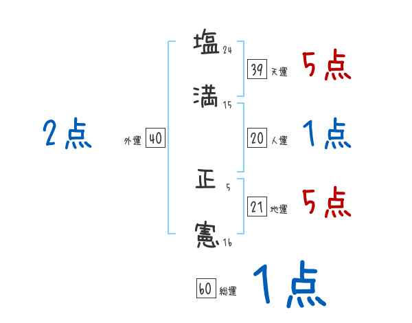 総運![]() | 塩満正憲さんの総運は60画の1つ星!悲観的で迷いやすい。波乱が多く損をしないように。 あなたの人生を表す1番重要な運勢です。生涯を通じて影響する総合運となり、主に50歳以降の晩年期に影響を及ぼします。 |