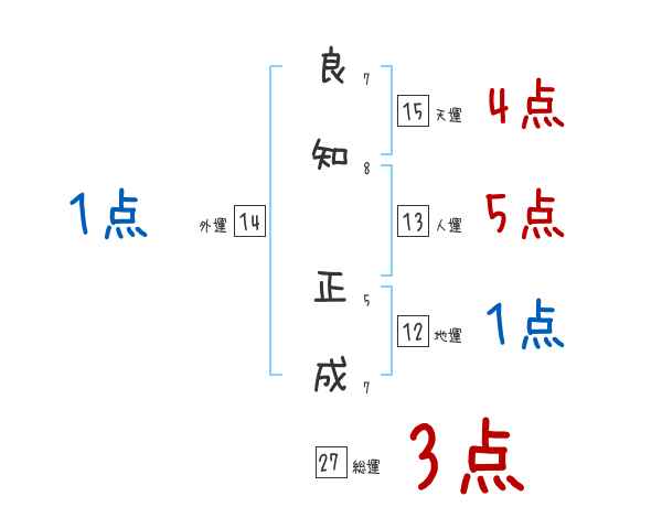 人運![]() | 良知正成さんの人運は13画の5つ星!才能に恵まれ人気がある。名声を手に入れる。円満な人生。 性格や才能などを表す2番目に重要な運勢です。人間関係や協調性、社会的な成功に影響します。主に20歳から50歳ぐらいまでの中年期の運勢を表します。 |