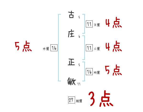 天運![]() | 古庄正敏さんの天運は11画の4つ星!着実に富や地位を得る幸運な人生。 家系が持つ宿命的な運勢を表します。祖先から受け継いだ苗字ですので自分の力が及びません。家柄を象徴します。 |