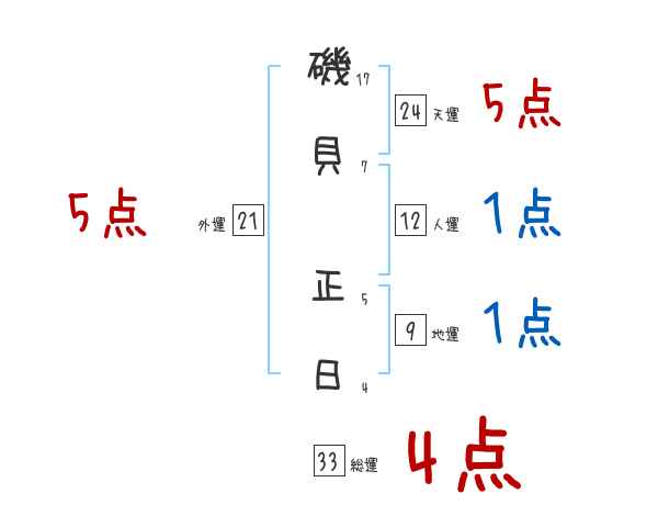 外運![]() | 磯貝正日さんの外運は21画の5つ星!統率力がある。独立し成功する。名誉を手に入れる。 生活面を象徴する運勢です。外部から受ける影響力を表し、結婚運、家庭運や職場、環境への順応性を表します。 |
