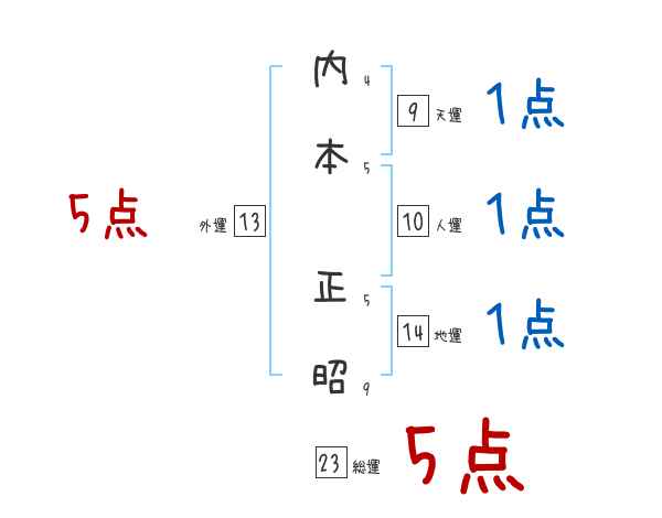 総運![]() | 内本正昭さんの総運は23画の5つ星!想像力に優れ活力がある。一代で成功し名誉を手に入れる。 あなたの人生を表す1番重要な運勢です。生涯を通じて影響する総合運となり、主に50歳以降の晩年期に影響を及ぼします。 |