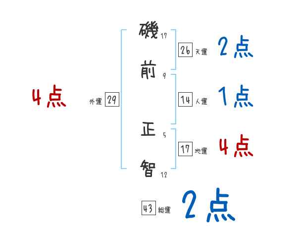 外運![]() | 磯前正智さんの外運は29画の4つ星!完全主義で才能がある。厳格な心の持ち主。 生活面を象徴する運勢です。外部から受ける影響力を表し、結婚運、家庭運や職場、環境への順応性を表します。 |