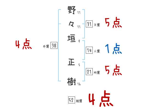 天運![]() | 野々垣正樹さんの天運は31画の5つ星!社交性があり判断力に優れる。順風満帆な人生で円満な生活。 家系が持つ宿命的な運勢を表します。祖先から受け継いだ苗字ですので自分の力が及びません。家柄を象徴します。 |